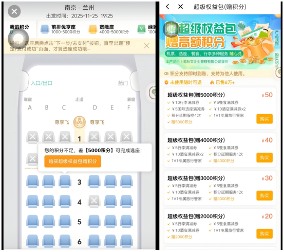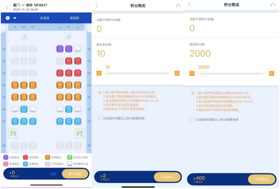 厦门航空11月22日厦门飞桂林(MF8847)航线中,权益兑换类锁定座位分为优选座位、首选座位、标准座位,分别对应2000积分、1600积分、1000积分的兑换门槛,消费者可以直接购买积分,最低购买量为10积分,对应售价2元。这意味着,若没有积分的消费者想在线上兑换此航班的优选座位,除支付经济舱基础票价,还需支付400元购买2000积分才能解锁该座位。四川航空11月12日南京飞成都(3U8988)航线,当选择经济舱第一排座位时,系统提示需支付3000里程,并亮色显示“购买里程”选项。点击后,可花费450元购买3000里程,解锁该座位。