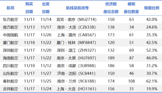 从锁座比例来看,10家航司购票阶段锁座比例介于19.9%—62.1%之间。其中,春秋航空11月25日南京飞兰州(9C6188)航线锁座比例达62.1%,深圳航空11月20日深圳飞湛江(ZH9327)航线锁座比例52.3%,海南航空、东方航空、厦门航空的相关航线锁座比例处于42%—46%的较高区间。